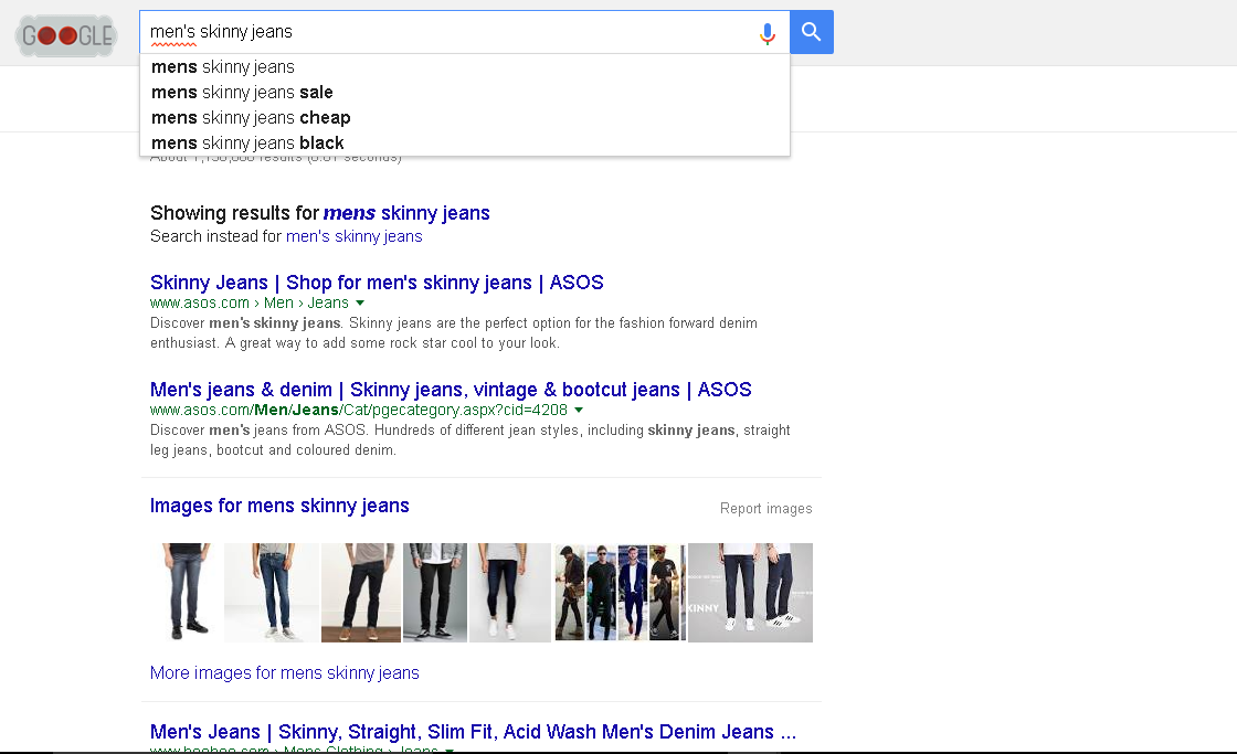 Let’s say you are selling men’s skinny jeans. You want transactional queries. Looking at the different search queries, you will notice that common keywords that pop up are: