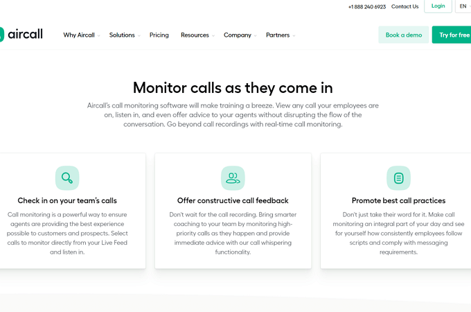 Use Aircall not just for call management but also for call monitoring. It includes call whispering and call monitoring on the second tier and higher to train call agents in real-time.
